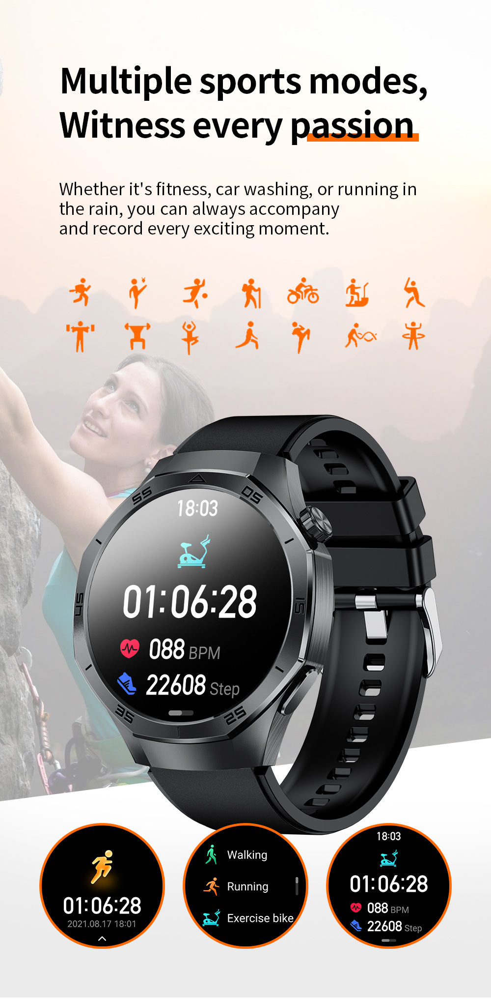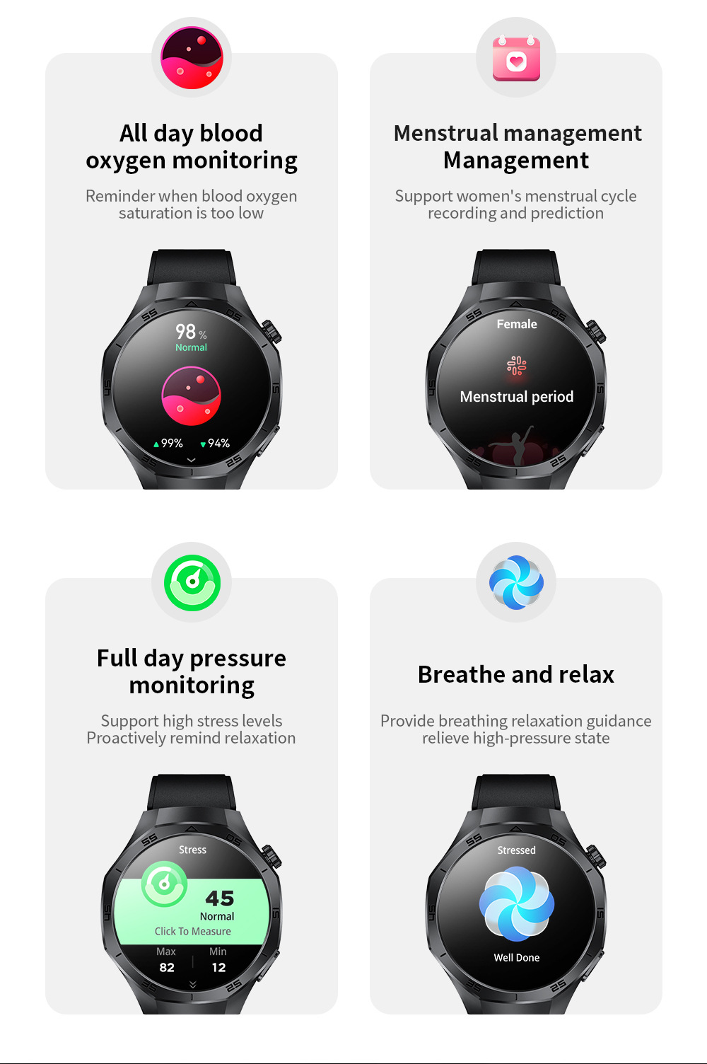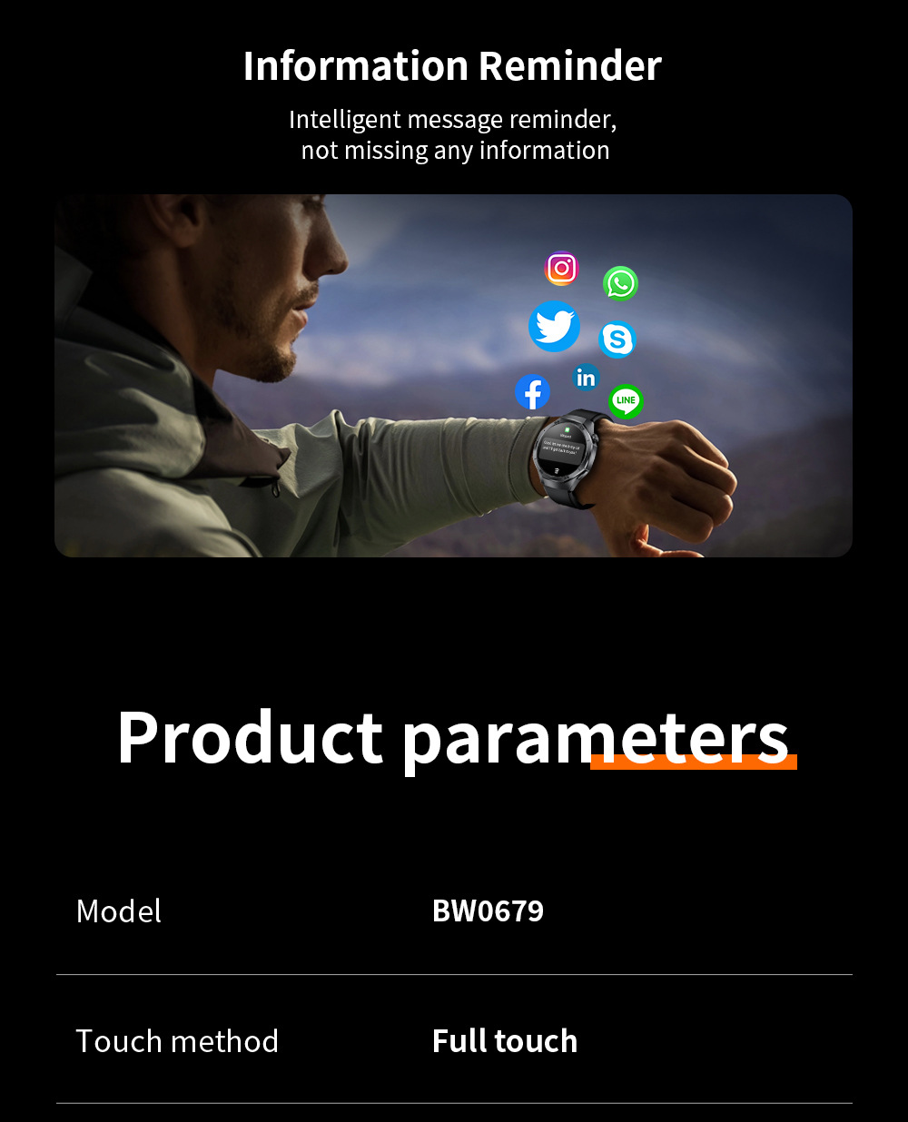 Functions: heart rate monitoring, blood pressure measurement, social entertainment, Bluetooth calling, smart reminder, sleep monitoring, blood oxygen detection